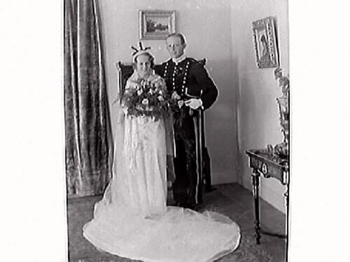 Brudparet Bruselius. Brudgumen är klädd i uniform.