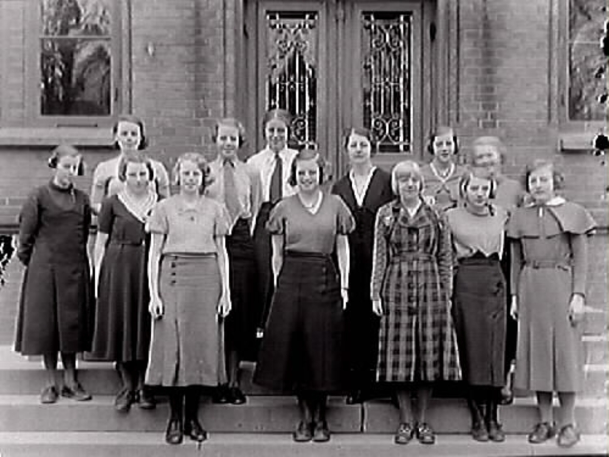Skolfoto. Skolklass. Varbergs elementärläroverk för flickor "Flickskolan" Flickorna i 5:e klass och klassföreståndare Lisen Ehrenborg (i mitten i mörk klänning) på skolans trappa.
