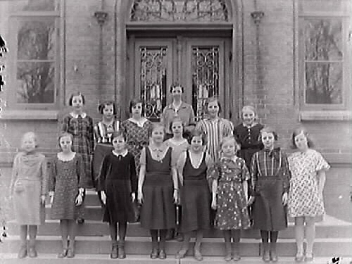 Skolfoto. Skolklass. Varbergs elementärläroverk för flickor "Flickskolan" Flickorna i 2:a klassoch lassföreståndare Hanna Röstin (i mitten längst bak) på skolans trappa.