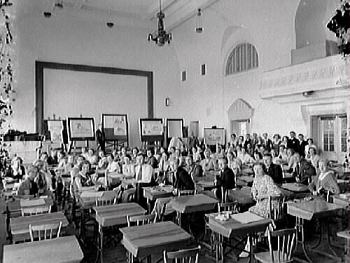 Teckningskurs i Södra folkskolans/Rosenfredsskolans aula. En talrik skara vuxna kursdeltagare sitter vid skolbänkarna. Läraren står bredvid några stafflier med teckningar av olika djur.