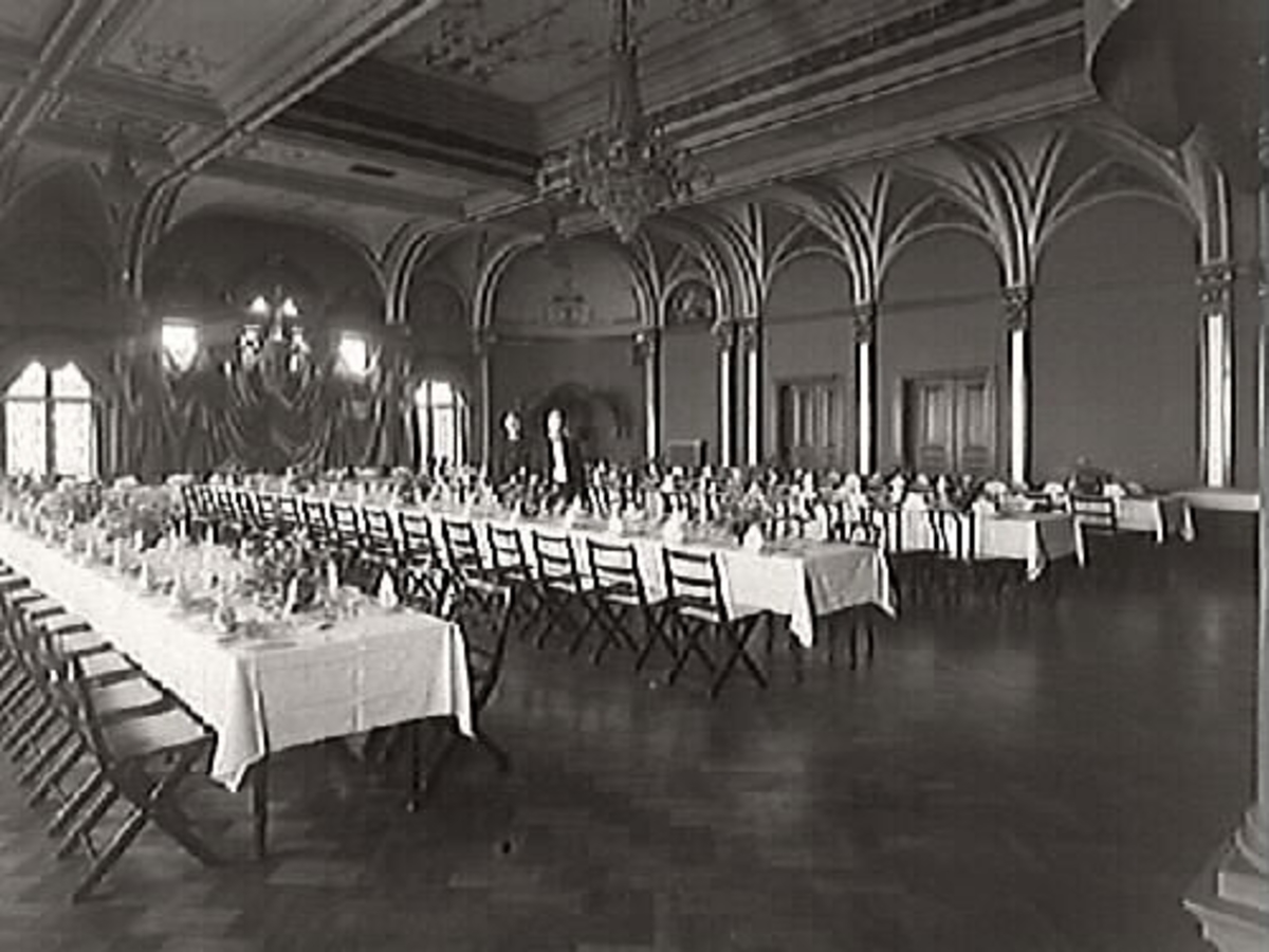 Dukade långbord i matsalen på Varbergs stadshotell. Två personer (personal) kontrollerar dukningen.