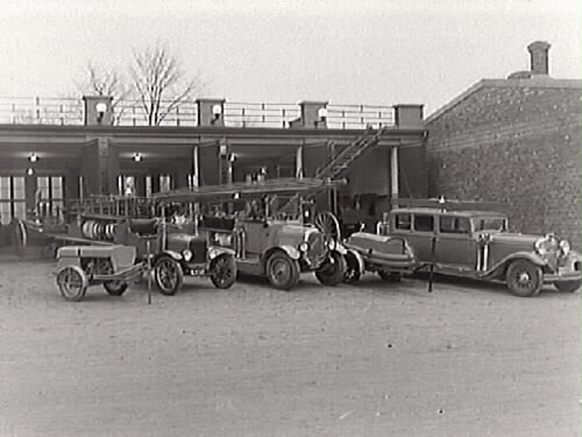 Brandkårens vagnhall på Engelbrektsgatan 5. Inne i vagnhallen till vänster syns en ångspruta. Ute på planen från vänster står en skumspruta, en brandbil T-Ford från 1918-1919, en brandbil Tidaholm från omkring 1928, en motorspruta, en personbil Lincoln utrustad som en utryckningsbil.