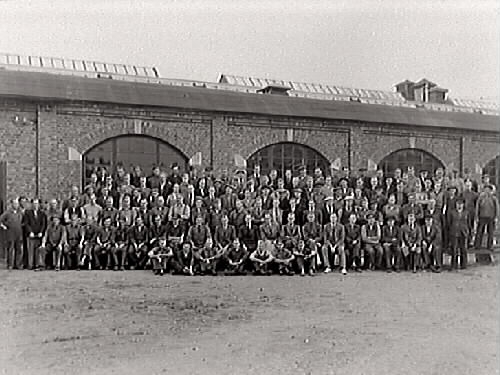 Personalgrupp. Arbetare och ledning vid Gunnebofabriken (kv Valen 3) uppställda framför en av fabriksbyggnaderna.