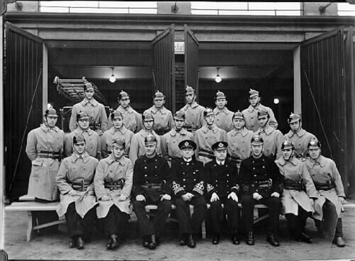 Personalgrupp. Reservbrandkåren i Varberg år 1938. Översta raden från vänster: Torsten Sandberg, Hendberg, Anders Eliasson, Kalle Gunnarsson, Sven Eliasson, Torsten Lindblom. Mittersta raden från vänster: Birger Wahlberg, Gösta Hammarqvist, Gunnar Dahlin, Larsson, Fritz Svensson, Bertil Rydberg, Gustav Halling, Ebbe Svensson, Isberg. Främsta raden från vänster: Allan Pettersson, Erik Lindblom, förman Sten Andersson, brandchef Reinhold Bengtsson, vice brandchef Hjalmar Sandström, förman Larsson, Harry Carlsson, John Edin. Brandstationen låg utmed Engelbrektsgatan, bredvid Teatern.