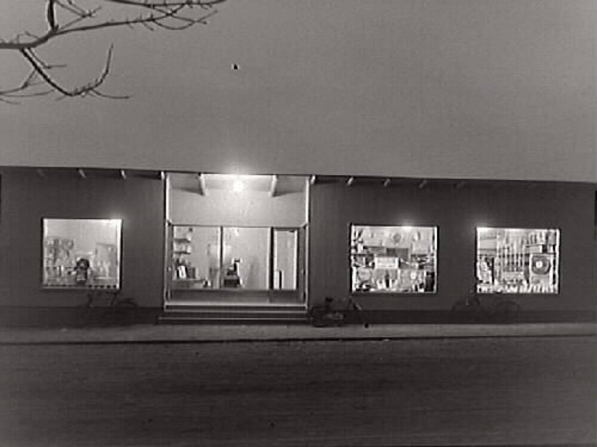 "Kooperativa". Butiken låg på Göteborgsvägen, kvarteret Uttern. Exteriörbild kvällstid då belysningen är tänd. Fasaden har ett indraget entréparti och skyltfönster såväl där som i fasaden. Några cyklar står parkerade längs väggen.