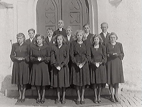 Kyrkoherde Gunnar Högberg i mitten med konfirmander utanför Hunnestads kyrka, Från vänster främre raden: Anne-Marie Pettersson, Elna Börjesson, Clauj Bartholdsson, Ulla Johansson, Maj Martinsson, Marian Bertilsson. Bakre raden: Göte Olsson, Sigvard Runevad, Bertil Johansson, Folke Irblad, Pauli Hallenberg.
