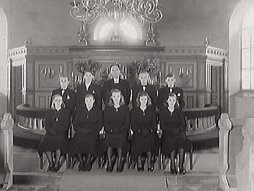 Prästen Wetterqvist (i mitten) med konfirmander i Valinge kyrkas kor.