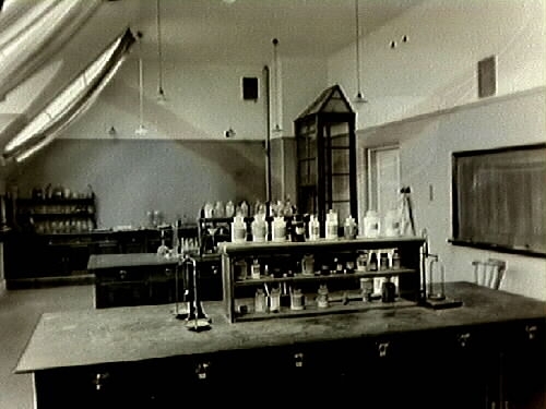 Interiör från en skolsal på Falkenbergs kommunala mellanskola. Av utrustningen att döma är det en kemisal.