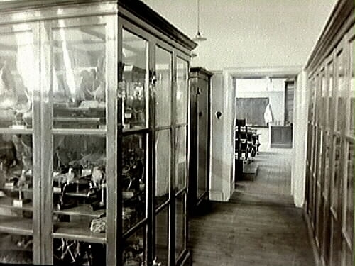 Skola, interiör från Falkenbergs kommunala mellanskola. En smal gång mellan stora montrar, fulla med undervisningsföremål, leder fram till en lektionssal. Man ser bänkar på gradänger och svarta tavlan längst fram.