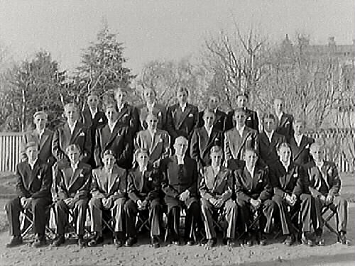 Konfirmation. "I mitten sitter kyrkoherde Ernst Sjöblom. Sittande från vänster: Karlsson, Ingvar Johansson 'Isse koja', Rune Larsson, Roine Henriksson, prosten Sjöblom, ?, Bo Klaesson,?, ?. Mellersta raden från vänster: Leif Friberg, Lars-Erik Andersson, Folke Hansson, Lennart Ekengren, Boström, ?, Karl-Axel Svensson, Bengt Eliasson ""Adams pojk"". Översta raden från vänster: Olle Ek, Lennart Andersson, ?, ?, ?, Göte Johansson, Liss Eriksson."