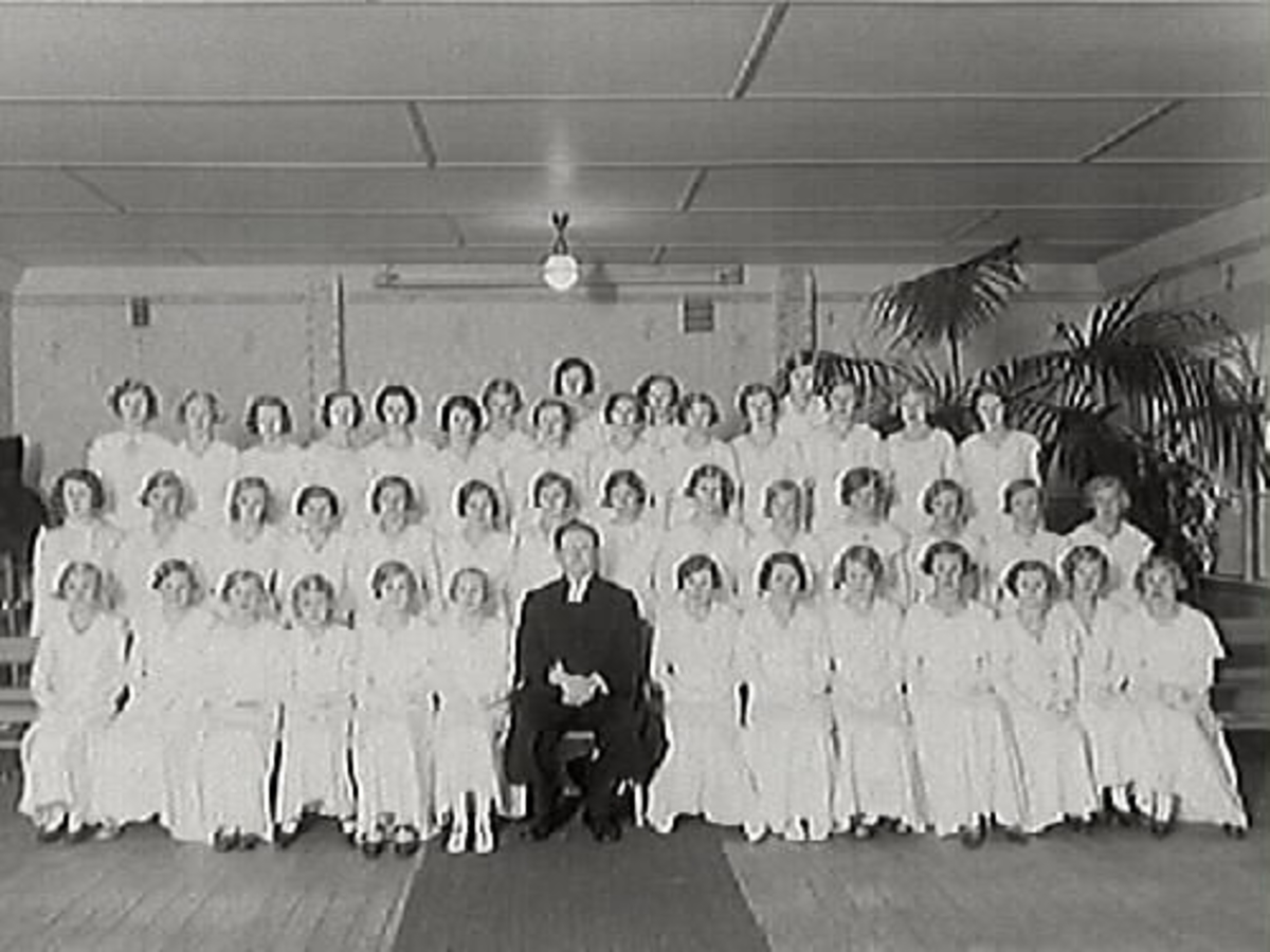 Prästen Aronius (sittande i mitten) med konfirmander, endast flickor. Till höger bakom flickorna syns en stor palmliknande krukväxt. Från vänster sittande: Greta Antonsson, Ingrid Paulsson, Inga Olausson, Lilly Bondesson, May Johansson, Marianne Nihlen, Maj Berntsson, Maj Eliasson, Mildred Lövgren, Signe Carlsson, Laga Hedberg, Ingrid Carlsson, Birgit Johansson 2:a raden: Ingrid Gunnarsson, Birgit Strandberg, Inga-Lisa Andersson, Anna-Lisa Andersson, Rut Johansson, Ingegärd Johansson, Lillan Johansson, Alice Carlsson, Elin Bengtsson, Maud Martinsson, Gunnel Carlsson, Anna Svensson, Herdis Andersson 3:e raden: Evy Granat, Karin Dahlstrand, Karin Rydberg, Kerstin Svensson, Hulda Johansson, Solveig Johansson, Elsa Sandberg, Kerstin Olsson, Inga Gustavsson, Sonja Andersson, Rut Svensson, Anna-Stina Johansson, Dagmar Thoresson, Thordis Johansson 4:e raden: Anna-Lisa Carlsson, Ingeborg Albrektsson, Anna-Greta Larsson, Gulli Antonsson, Kerstin Backman.