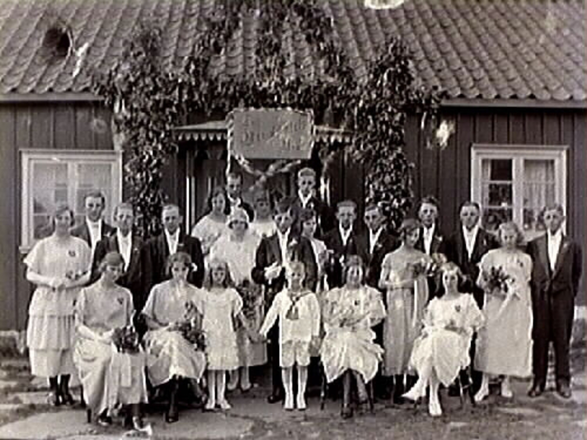 Brudpar och brudfölje och bröllopsgäster vid en äreport.