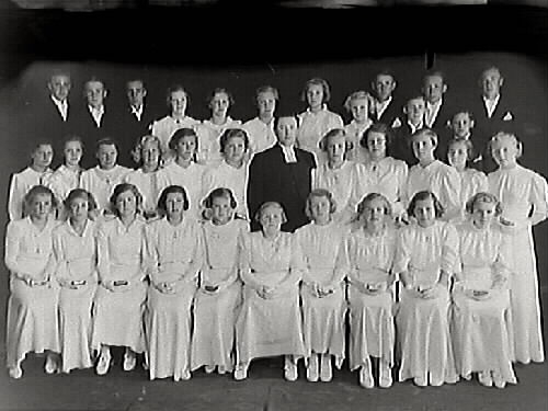 Konfirmation. Prästen i mitten heter Frans Egardt. Från vänster sittande: Anna-Greta Berg, Liljegren, Ingrid Olsson, ?, ?, Astrid Hermansson, resten okända. 2:a raden: nr 7 Ingrid Johansson. 3:e raden: Nyrén, Bertil Brink, Viktorsson, ?, ?, Arne Bergstrand, resten okända.