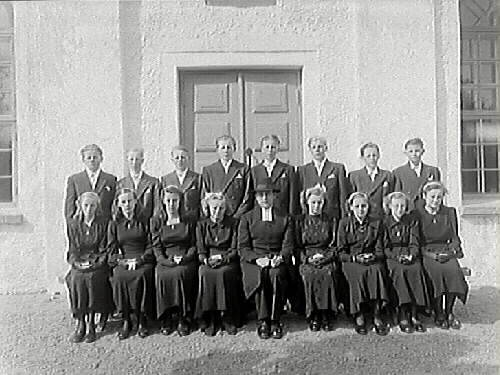 Konfirmandgrupp med pastorn i mitten, Edvin Elmkvist.