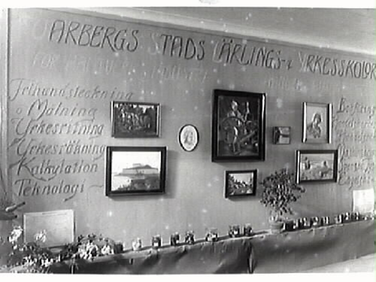 Utställningsskärm som marknadsför Varbergs yrkesskola. Bilden tagen vid Hantverksmässan i Varberg 1927, i Gamlebyskolan.
