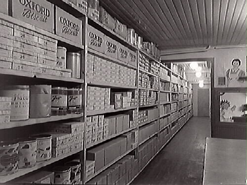 Interiörbild från Helge Nilssons speceributik som låg vid hörnet Borgmästaregatan-Östra Långgatan, Kv Färgaren. Snabbköpet, eller "självbetjäningsbutiken" där kunderna själva fick plocka sina varor var då helt nytt. Detta ställde helt nya krav på tillverkarna på förpackningarna. Fotografiet är taget samma år som Kooperativa i Stockholm öppnade sin första butik av samma slag.