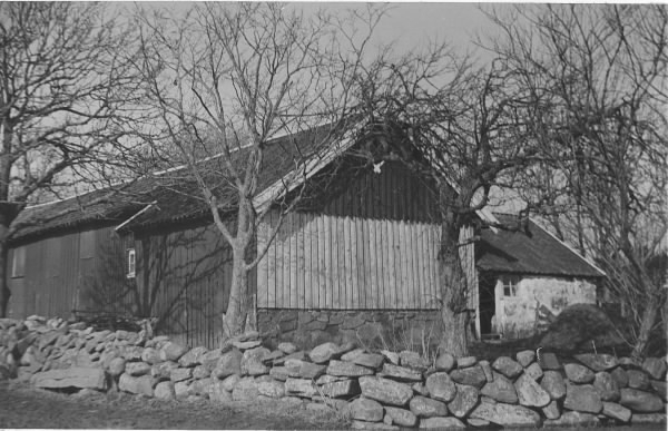 Gården Bäcken i Onsala. Ladugården ser ut att nyligen ha bytt gavelfasaden. Tomten hägnas av en stengärdsgård.