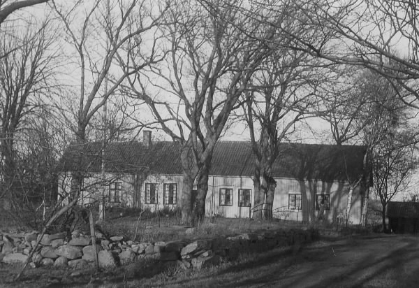 Bostadshus, gården Gatan på Onsala där kaparkaptenen Lars Gathenhielm bodde, Lasse i Gatan. Det långsträckta, timrade huset skyms av stora träd i förgrunden och utmed vägen löper en stengärdsgård.