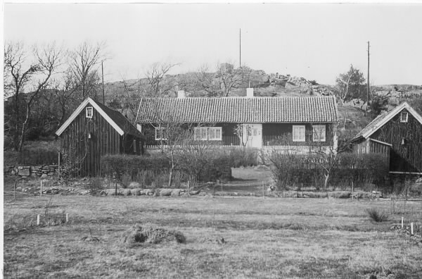 Hunsås i Onsala, södra gården med trädgård. Bostadshuset i mitten är flankerat av två uthus. Vid gaveln på det högra är ett dass tillbyggt. Både Hunsås 1:2 och 1:3 är gamla kaptensgårdar.