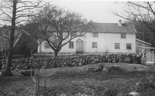 Mangårdsbyggnaden på gården Lyngås i Onsala, troligen Lilla Lyngås. På ömse sidor skymtar ekonomibyggnader och till höger leder en trägrind in till trädgården, som hägnas av stengärdsgårdar.