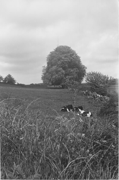 Vilande nötkreatur i en beteshage nära Runsås i Onsala. Längre upp i backen avtecknar sig en grupp stora almar mot himlen.