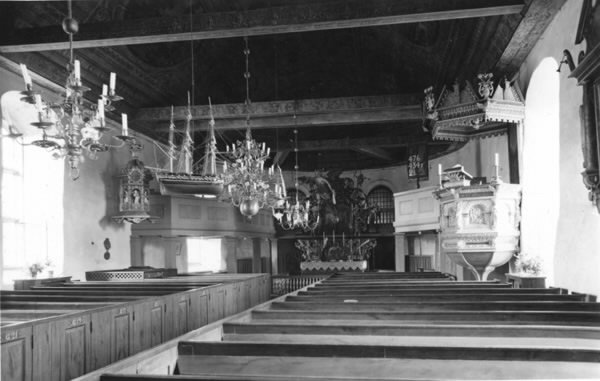 Interiörbild av Onsala kyrka tagen från sydväst över bänkarna mot altaruppsatsen. På ömse sidor om denna sitter kaptensläktarna. Predikstolen sitter på den ursprungliga sidan och ljuskronorna över mittgången har inte elektrifierats.