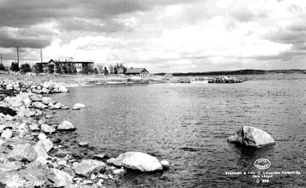 Vykort, "Draget, Onsala". Strandvy med stenig strand med vy mot östra sidan av Kungsbackafjorden. Till vänster ligger en villa med en byggnad vid vattnet, kanske ett båthus.