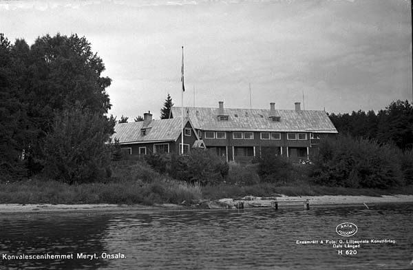 Vykort, "Konvalescenthemmet Meryt, Onsala" omgivet av skog alldeles invid Kungsbackafjorden. Flaggstång med hissad flagga en lugn dag. Havet i förgrunden. Uppfördes av Blanche Dickson på Tjolöholm och invigdes 1901.