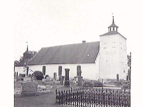 Kyrkan i Onsala sedd från nordväst. Trätornet är från 1700-talets mitt. I förgrunden en grav med smidesstaket.