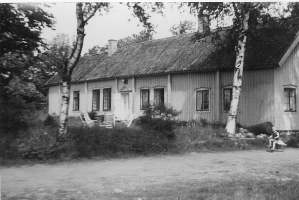 Gården Gatan i Onsala där kaparkaptenen Lars Gathenhielm bodde. Boningshuset sett från entrésidan. Till höger kommer en liten pojke cyklande på en trehjuling.