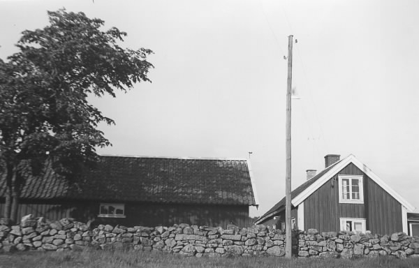 Lantgård vid Häcklahagsvägen, Onsala. Bostadshus och ekomomibyggnad bakom en stenmur. Framför gärdsgården står en elstolpe.