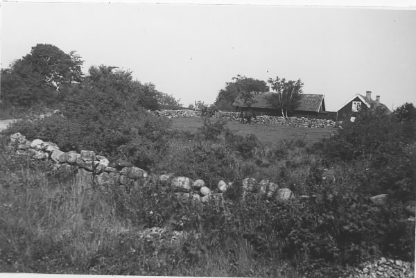 Bostad, lantgård vid Häcklahagsvägen "Sommargården", Onsala. Byggnader är delvis dolda bakom låga träd och buskar. I förgrunden en hage inhägnad av stengärdsgårdar.