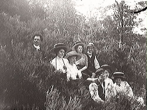Utflykt. Ett sällskap män och hattbeklädda kvinnor sitter i en skogsbacke.