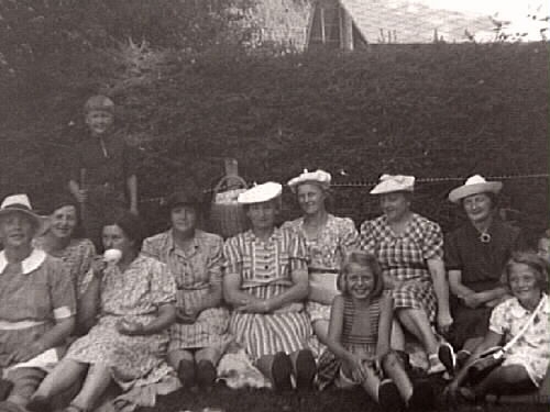 Utflykt. En grupp kvinnor och några barn sitter vid en granhäck och dricker kaffe. Bakom dem står en picnic-korg.