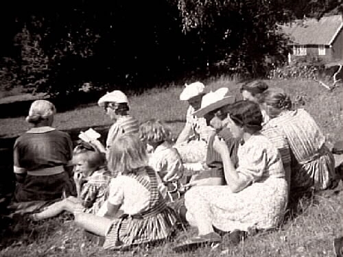 Utflykt. En grupp kvinnor och några barn sitter på en äng. En av kvinnorna längtfram håller upp och läser i en liten bok. I bakgrunden syns en skogsdunge och ett hus.