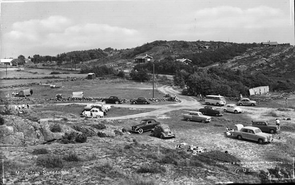 Vykort, "Motiv från Sanddamm", Väröbacka. Vy över karg, bergig kustnära plats med parkerade fordon, tält och människor på utflykt. Folk solar och sittander vid ihopfällbara trädgårdsbord.