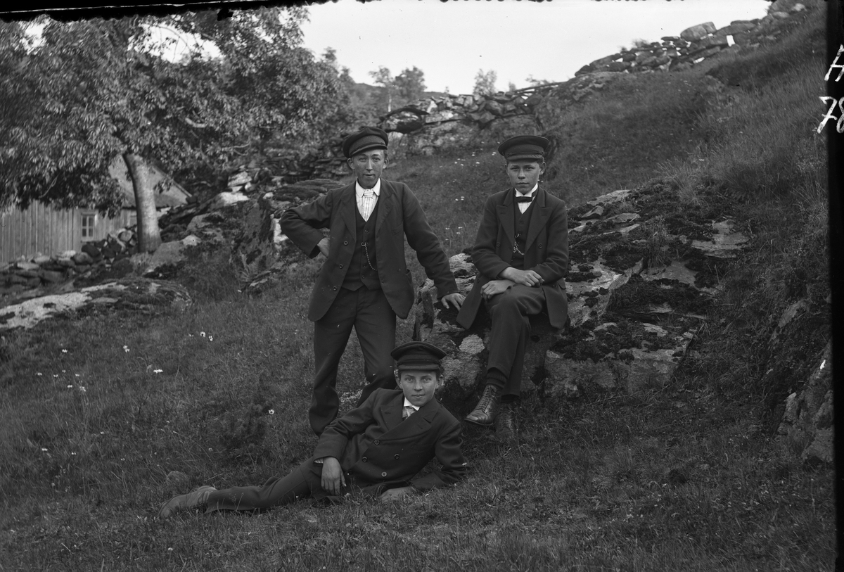 Tre ynglingar i liknande klädsel vid en sten i brant grässluttning. Troligen bär de någon form av arbetsklädsel med skärmmössa, väst med fickur i kedja och kavaj. I bakgrunden ligger en gård som hägnas av en stengärdsgård. Den stående killen benämns i bildförteckningen som "Olas-Johan N".