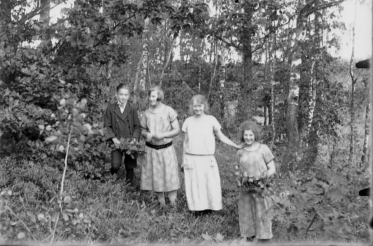 Tre ungdomar, tre flickor och en pojke, står i en skogsbacke med löv- och blomsterbuketter.