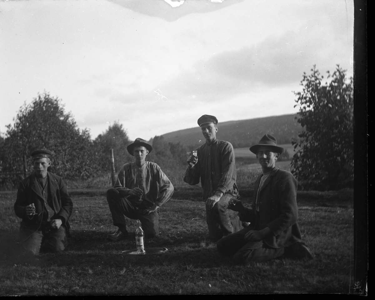 Fyra ynglingar sitter och huttar ute i det gröna (eventuellt en skyttevall), kring en spritflaska på bricka. De poserar för fotografen med var sitt supglas i handen. I bakgrunden skogsklädda höjder och odlingslandskap.