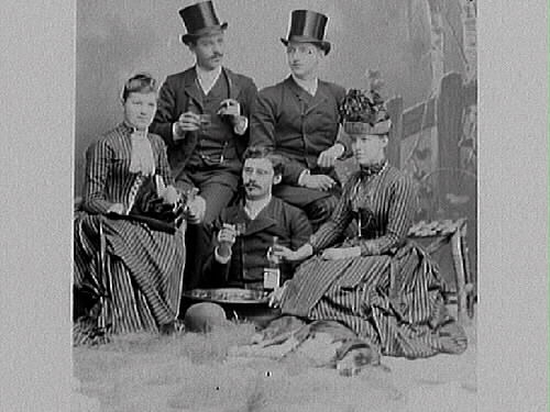 Arrangerat ateljéfoto av en utflykt med dryck och rökverk. En man sitter mellan två kvinnor i randiga klänningar och bakom dem två män i höga hattar. Han till höger låtsas luta armen mot fondens staket. Längst till höger sitter fotografen, Mathilda Ranch.