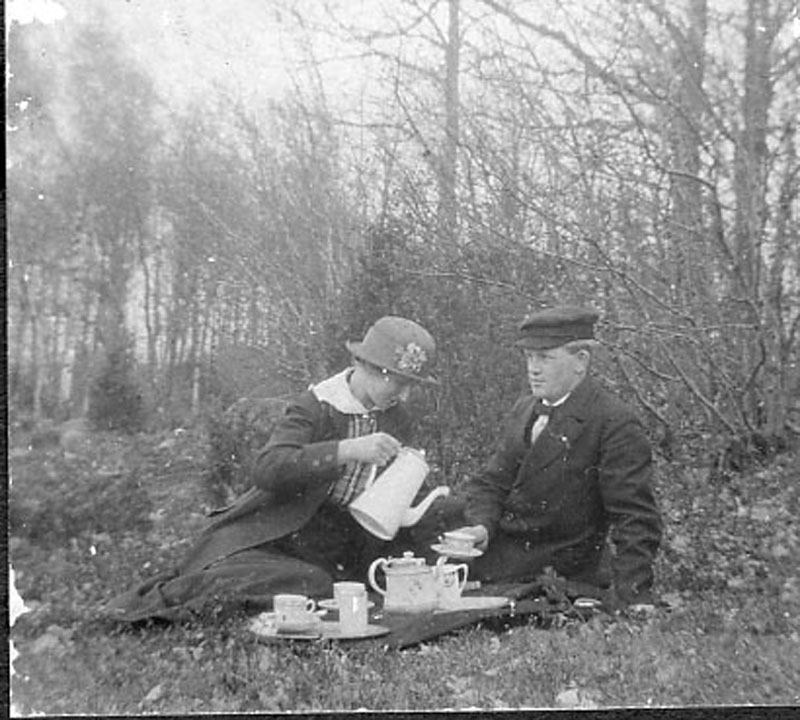 John Algot Carlsson på utflykt i en skogsdunge med kvinnligt sällskap i vårhatt. De har dukat upp med porslinsservisen och hon häller upp åt honom ur kaffekannan. Omkring 1915.