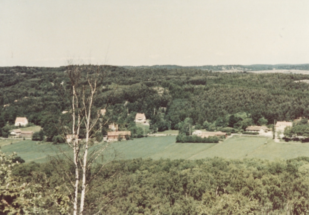 Vy från Sagåsbergets topp över Vommedal Östergård 1950-tal. I mitten ses Streteredsvägen och till höger Livereds skolbyggnader.