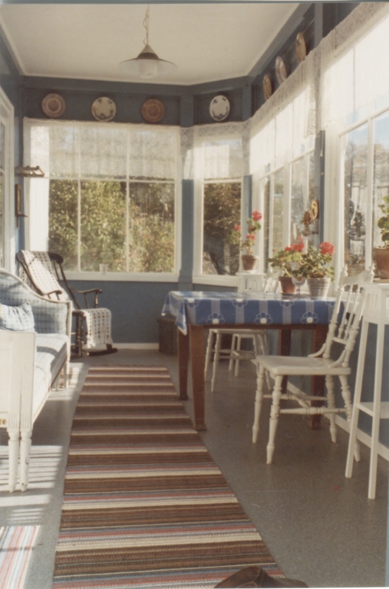 Veranda med dess interiör, "Sandbergs" Sagered 3:3 1970-tal. Verandan byggdes cirka 1900 och ritningen till den finns i Sageredsarkivet hos Kållereds Hembygdsförening.