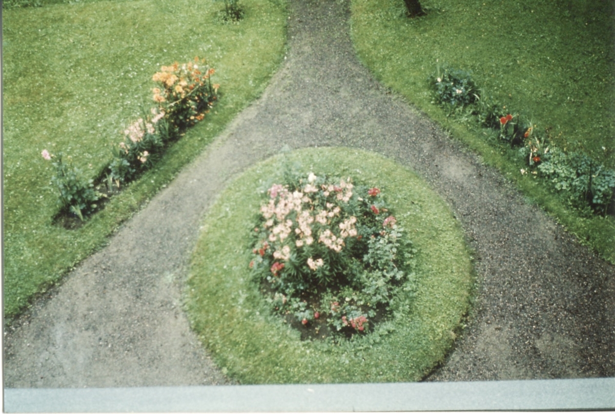 Trädgården med dess planteringar som ligger nedanför verandan, "Sandbergs" Sagered 3:3 cirka 1970. Relaterat motiv: A3767.