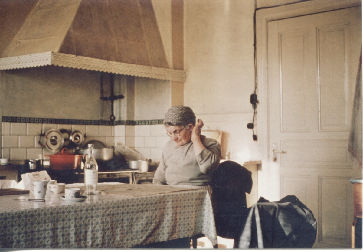 Hilda Sandberg (1887-1973, född Olsson) sitter i sitt kök och läser tidningen, "Sandbergs" Sagered 3:3 1960-tal.