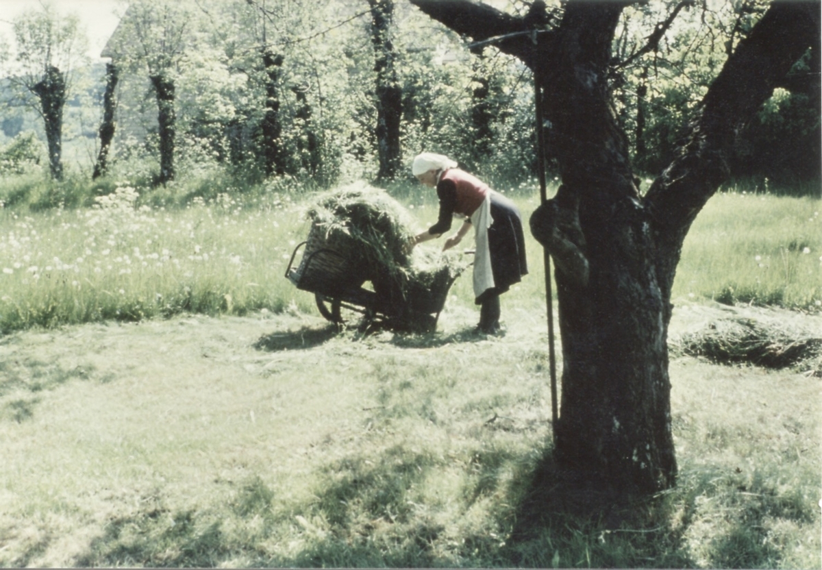 Hilda Sandberg (1887-1973) samlar ogräs i korgar som står på en kärra, "Sandbergs" Sagered 3:3 1960-tal.