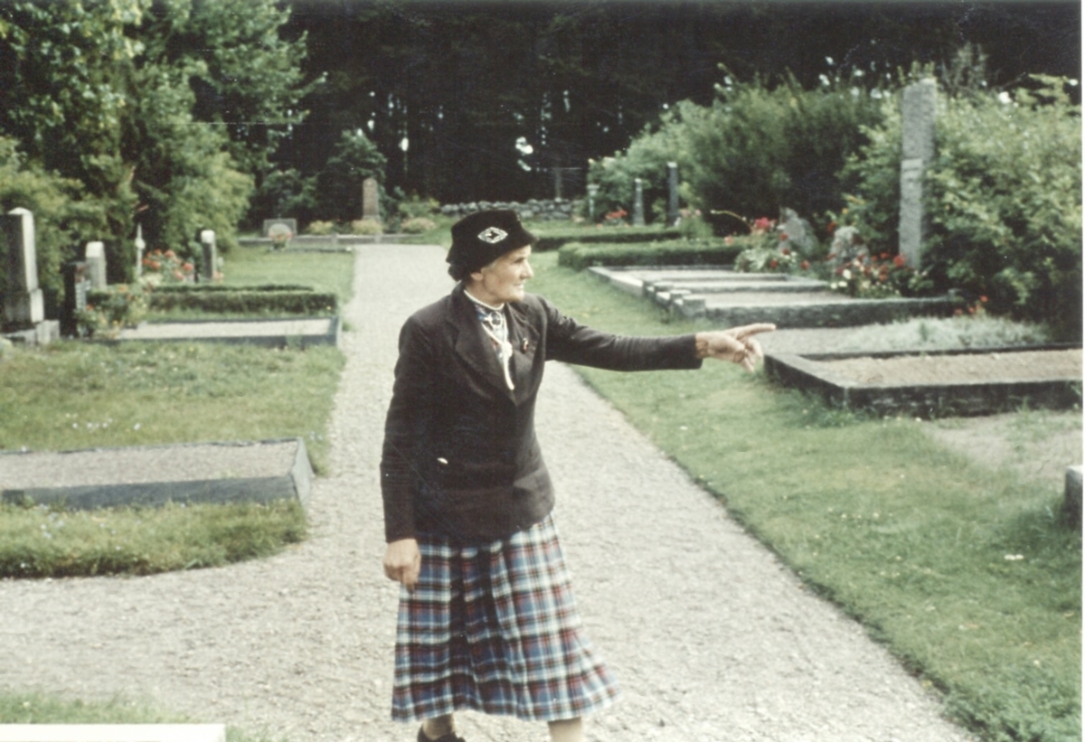 Hilda Sandberg (1887-1973, född Olsson), "Sandbergs" Sagered 3:3, är på utflykt och besöker Hjärtums kyrkogård (Lilla Edet) 1960-tal. Hilda var fosterbarn i Hjärtum.
