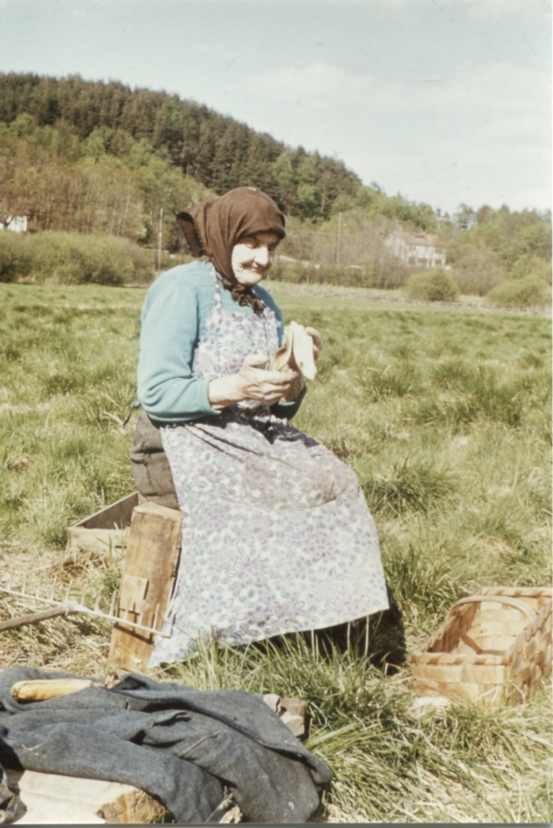 Fikastund ute på åkern för Hilda Sandberg (1887-1973), "Sandbergs" Sagered 3:3 1960-tal.