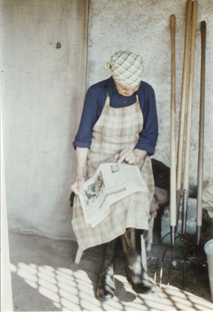 Hilda Sandberg (1887-1973, född Olsson) sitter under verandan och läser Göteborgs-Posten, "Sandbergs" Sagered 3:3 1960-tal.