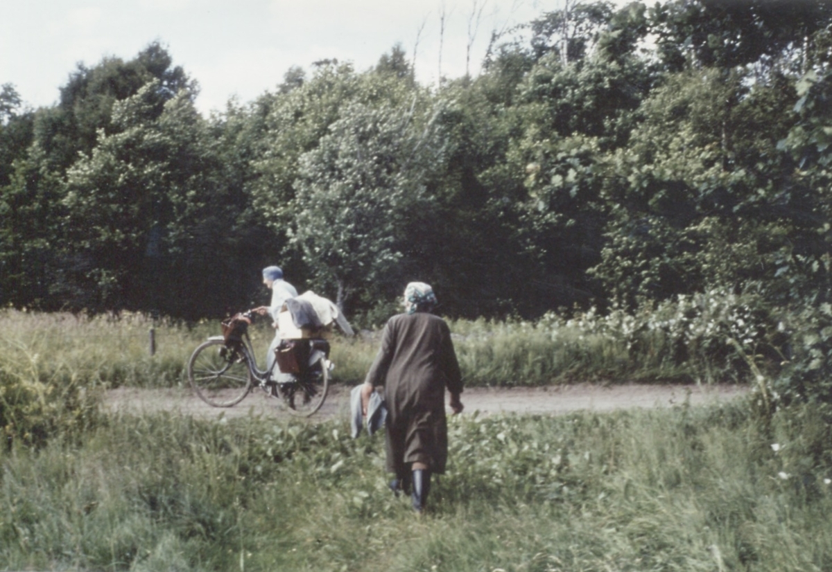 "Sandbergs" Sagered 3:3 1960-tal. Från vänster: okänd person med cykel samt Hilda Sandbergs (1887-1973) ryggtavla.